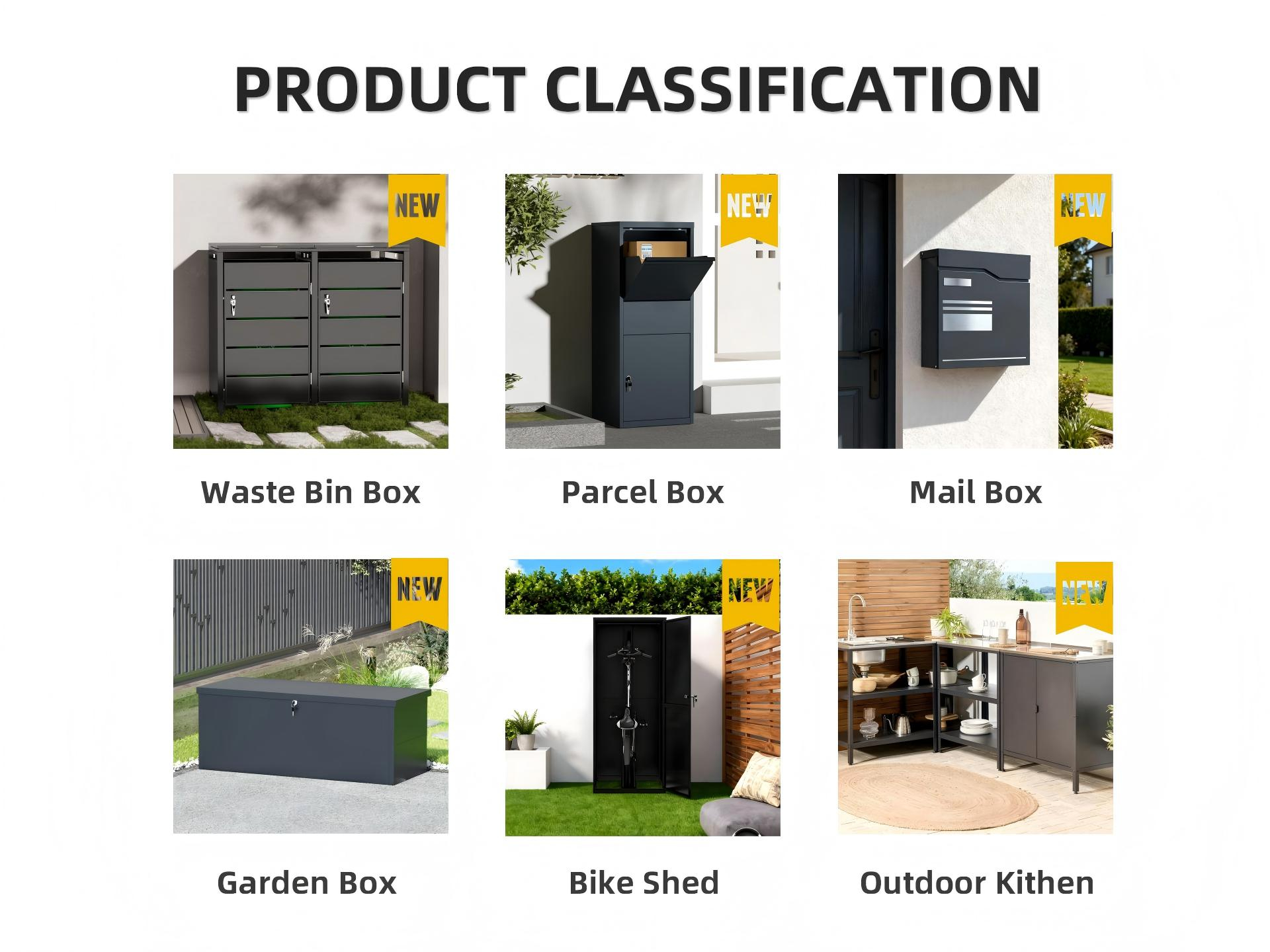 מוצרים עיקרייםקופסת אשפה חיצונית, תיבת טיפת חבילה, ארון אחסון הבית, סככת אופניים